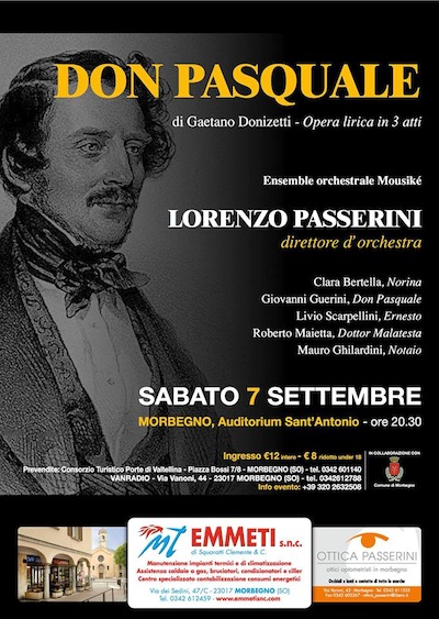 A MORBEGNO appuntamento con la grande lirica Sabato 7 settembre alle 20.30 nella splendida cornice dell’Auditorium Sant’Antonio verrà rappresentata l’opera buffa “Don Pasquale”, del compositore bergamasco Gaetano Donizetti. Cristina CulantiData: 28/08/2013