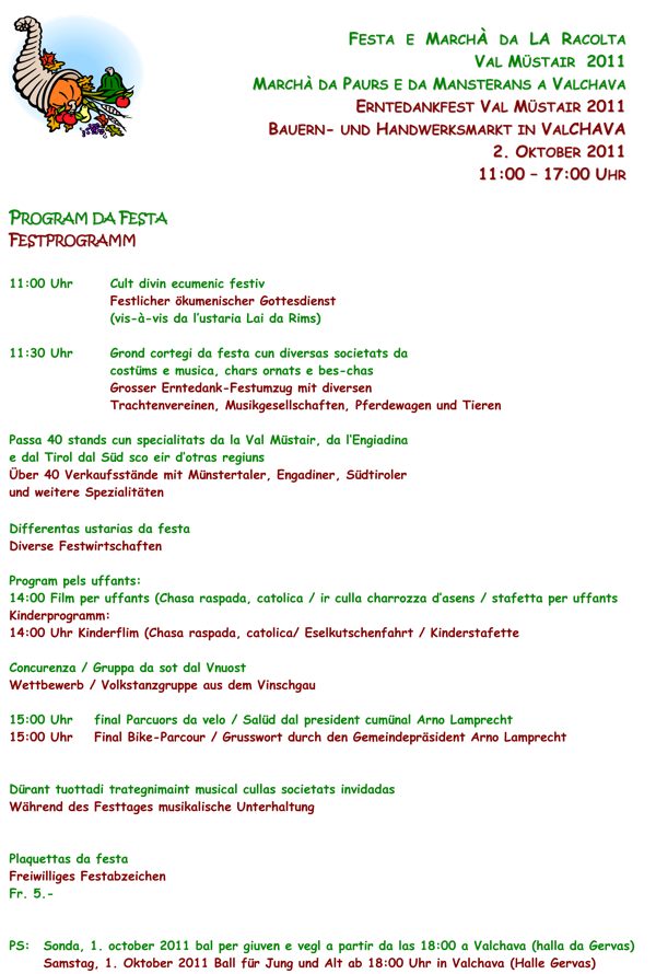 Festa e Marchà da la RACOLTA in Val Müstair domenica 2 ottobre! I bambini sfilano e si possono gustare i prodotti della tradizione gastronomica della vallata della Bassa Engadina ma anche quelli del Sud Tirolo. Dalle 11.00 alle 17.00 spazio anche alla musica e ai saluti del president cumünal Arno Lamprecht. Ma la festa inizia già il sabato sera, quando a Valchava è in programma una serata danzante “per giuven e vegl”! Per tutte le età, quindi.