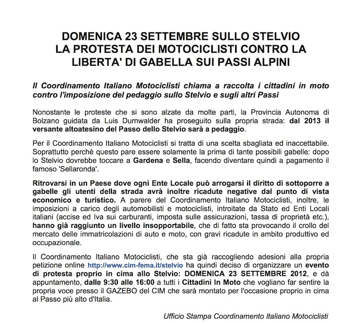 Il Passo più alto d’Italia e una delle strade più spettacolari del mondo sotto i riflettori da sempre e ora più che mai dopo la decisione della Provincia Autonoma di Bolzano di far pagare il pedaggio sul versante autoatesino. Ad alzare la voce il Coordinamento Italiano Motociclisti, che chiama a raccolta gli amanti delle due ruote domenica 23 settembre, per dire no a questa imposizione. L’appuntamento è in cima al Passo dello Stelvio, dalle 9.30 alle 16.00.
