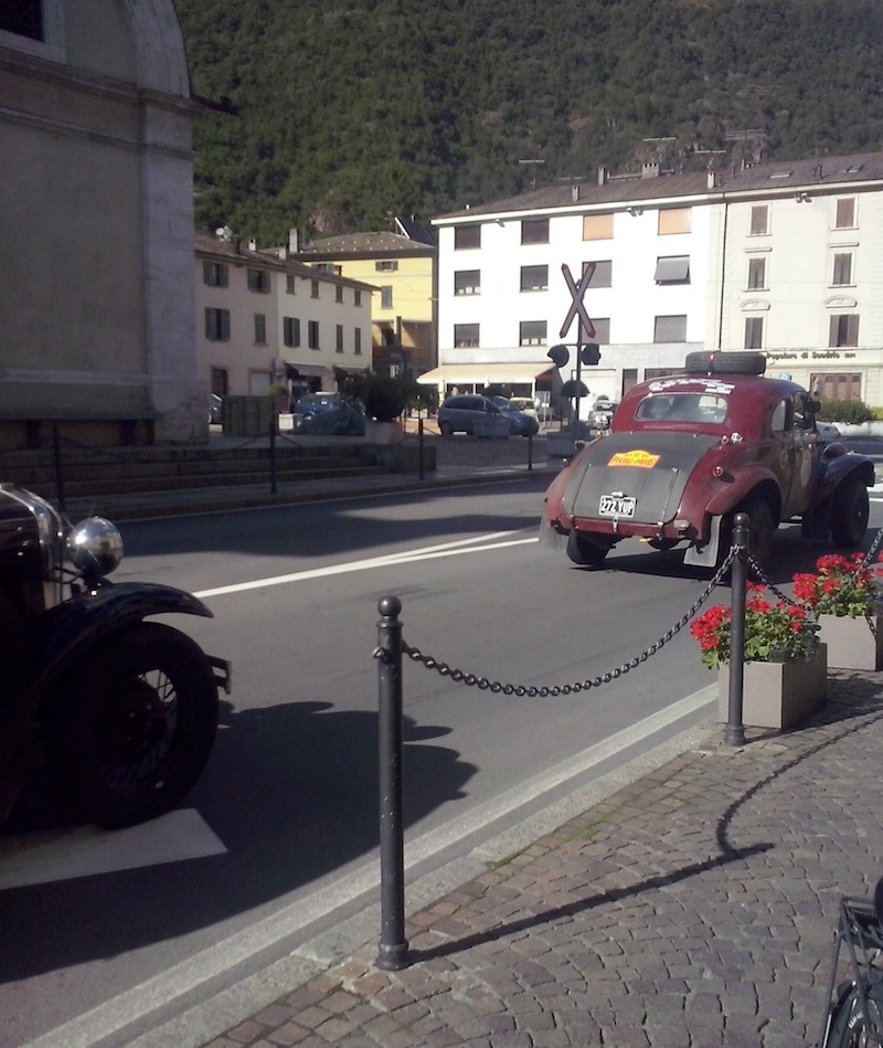 17.30, 18.30... passano alla spicciolata all’ombra della Basilica di Madonna di Tirano... Salutano, su macchine a volte anche scocciate ai lati. Avventurieri, non c’è che dire. Avventurieri che sfidano la strada su quattro ruote d’epoca che rombano senza timore delle distanze, che non s’interessano della velocità. Viaggiatori, anche se un viaggiatore è definita quella persona che non segna la data di ritorno a casa, viaggia e basta... Appunto, quindi, viaggiatori che calcano le strade meno facili, a bordo di auto "meno facili", anche da guidare e da domare!!!!