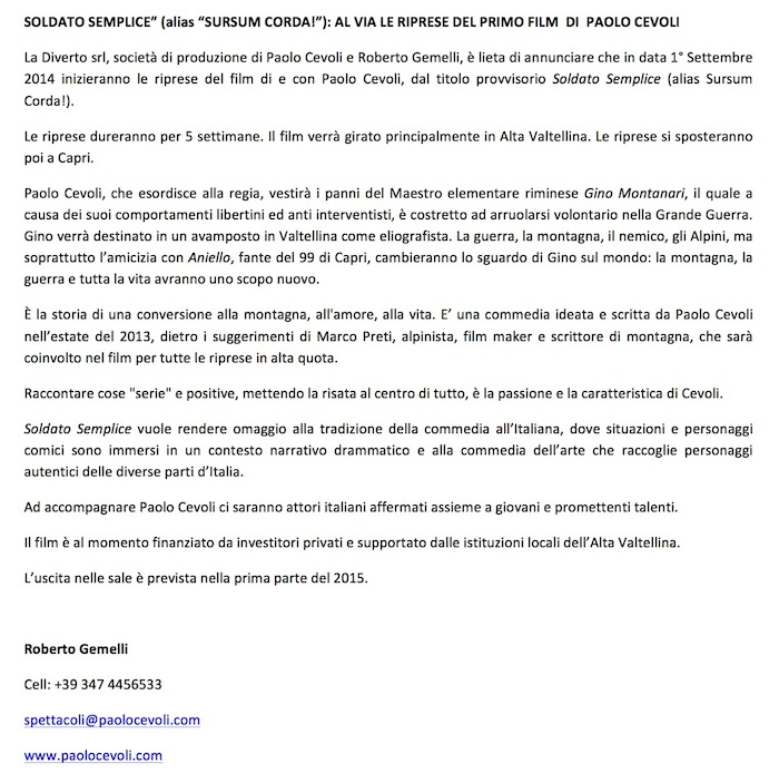 L?Alta Valtellina protagonista nel film di Paolo CevoliLe riprese del film "Soldato semplice" (titolo provvisorio) avranno inizio il primo settembre. Il film verrà girato principalmente in Alta Valtellina.(Nella foto, il Forte di Oga, Valdisotto) Cristina CulantiData: 26/08/2014 26/08/2014, 15:55Esordio alla regia Info e trama cristina culantiAutore dal 27/10/2021