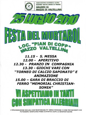 Domenica 25 luglio è grande festa in Mortirolo, in località Pian di Coop, grazie al Gruppo Alpini di Mazzo di Valtellina. A tavola si gustano i piatti tipici, nei prati si gioca e si scherza e con la mente si ricordano i due giovani Christian e Sonia con la gara di braccio di ferro in loro memoria.