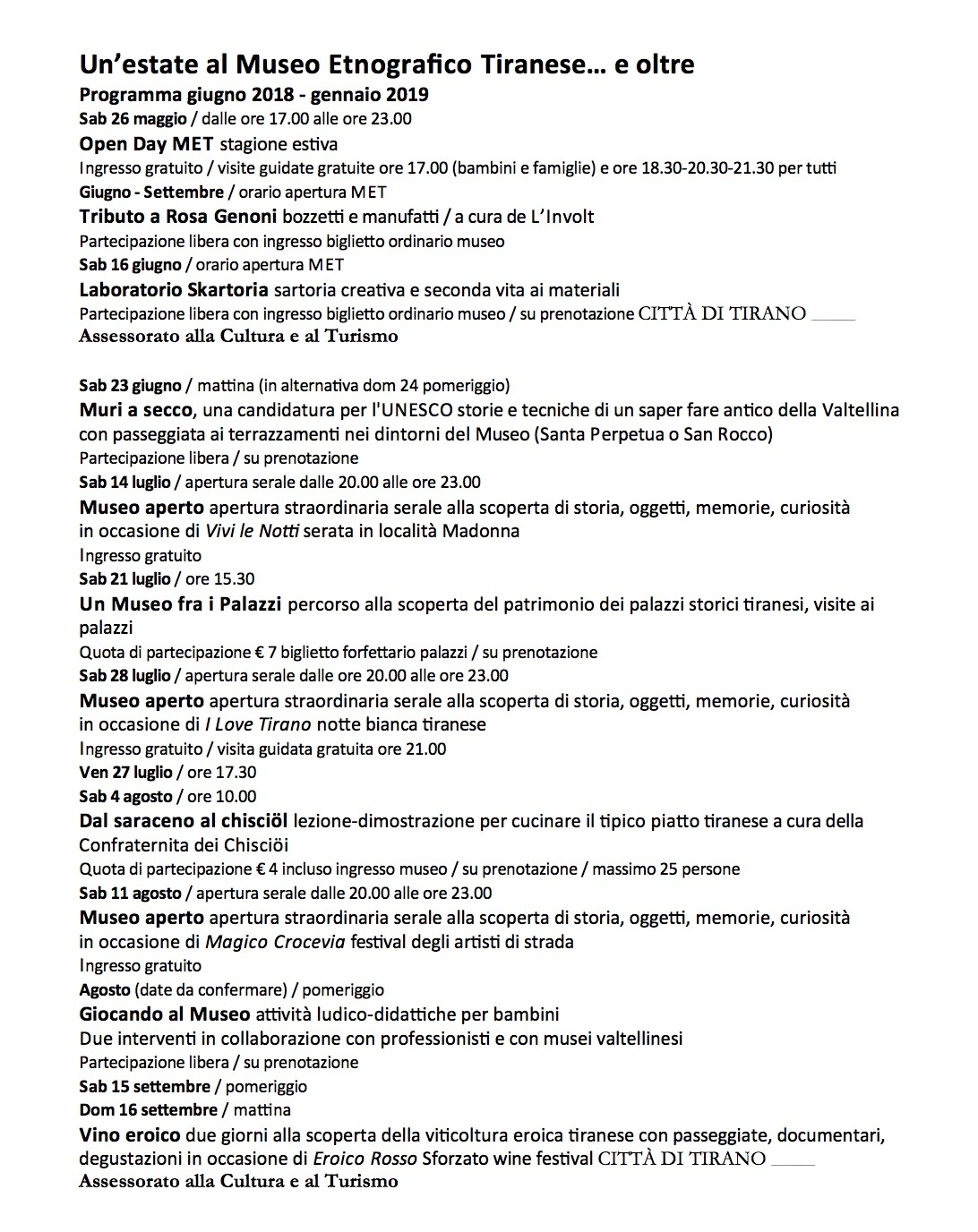 Attività rivolte a tutti quest’estate al Museo Etnografico tiranese. La presentazione del ricco programma questa mattina, 23 maggio, nel giardino dell’edificio. Attività pensate anche alla luce del percorso partecipato con la cittadinanza intorno al ruolo del Museo nella comunità tiranese, in collaborazione con l’associazione culturale sondriese AlpLab, che ha fatto emergere le criticità, ma anche le potenzialità, restituendo da un lato una valutazione riassumibile nelle parole: non conosciuto, statico, poco pubblicizzato, isolato. Per contro, fra le parole chiave che hanno identificato il ruolo del museo c’erano: memoria, storia, identità, conservazione, cultura, mentre altri termini hanno messo a fuoco elementi sentiti come necessari per ridare al museo un ruolo centrale: turismo, tecnologie, agricoltura, laboratori, studenti. Era altresì emerso il concetto di polo culturale della città e museo diffuso. E c’è molto, tanto, nel programma stilato dall’assessorato alla Cultura e Turismo del Comune di Tirano, Sonia Bombardieri, con l’impresa culturale L’Involt diretta da Luca Bonetti e Silvia Perlini, che per anni ha collaborato con il MET, profonda conoscitrice del patrimonio museale e l’esperto Gottfried Parrer, archeologo ed operatore culturale, che ha al suo attivo collaborazioni con il Museo di Poschiavo, il Museo di Palazzo Salis e che attualmente opera anche al Parco delle Incisioni Rupestri di Grosio. "Gottfried Parrer è incaricato di realizzare un piano di rilancio del museo a partire da quanto è emerso dal percorso partecipato, - spiegano dal Comune - un piano per il quale anche la collaborazione con L’Involt, che ha conoscenza diretta del Museo, è fondamentale e che comprende: l’indagine sull’utenza reale e potenziale del museo e la valutazione sull’orario di apertura; il piano di comunicazione volto a migliorare la promozione del Museo; la predisposizione delle linee guida per un futuro piano di gestione; la progettazione di un piano di sviluppo culturale e turistico con l’avvio di azioni sperimentali nell’anno 2018". Ma non è tutto: "L’Assessore alla Cultura e al Turismo Sonia Bombardieri, in collaborazione con AlpLab, ha messo a punto un progetto di valorizzazione del Museo per il quale è stato chiesto un finanziamento a Regione Lombardia a valere sull’Avviso Unico Cultura dal titolo ’Un museo per la comunità, una comunità per il museo’ e che prevede una prima annualità di interventi per l’innovazione della comunicazione del patrimonio culturale del museo con tecnologie multimediali, la valorizzazione di documenti fotografici e percorsi conoscitivi per tutte le età. Accanto a questo, è allo studio, un progetto per il coinvolgimento delle scuole a livello mandamentale". (Dal 1° giugno il MET resterà aperto regolarmente dalle 10.00 alle 12.30 e dalle 15.30 alle 18.00 in attesa di valutare, in base alle visite dell’anno, eventuali cambi di orari e periodi). CLICCARE SULLE IMMAGINI PER VISIONARE I PROGRAMMI, ANCHE FUORI PORTA) |