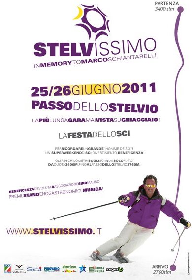 STELVISSIMO, LA PIU’ LUNGA GARA DI SCI SU GHIACCIAIO Per ricordare un grande “homme de ski”, ex preparatore atletico delle nazionali azzurre di sci, responsabile tecnico della rivista Sci, giornalista sportivo, amico di tanti e dello “Sci”, il 26 giugno il Passo dello Stelvio (So/Tn) ospiterà, per il secondo anno, la più incredibile gara estiva di sci, Stelvissimo. Più di quattro chilometri in un solo fiato, dalla Punta degli Spiriti (3400 m.) fino al Passo dello Stelvio (2760 m.) la più lunga gara su ghiacciaio mai vista. Il percorso sarà tracciato da porte direzionali che si snodano su tutto il percorso, la sciata è lunga e piuttosto impegnativa, in particolare nella seconda parte, ma alla portata di tutti gli sciatori dal medio livello in su. Lo spirito della manifestazione è quella del puro e sano divertimento: un’emozione unica, rappresentata dal piacere di una grande “sciata estiva”, su una pista a completa disposizione. Si parte due alla volta e si affronta la prima parte di gara in campo libero per arrivare primi all’inizio del tracciato, da qui un lungo gigante porterà fino al Passo dello Stelvio. Un evento che vuole riunire tutto quello che fa grande lo sci in Italia, un’occasione per divertirsi, ritrovarsi e fare beneficenza. Saranno presenti molti nomi che hanno fatto la storia dello sci, molti i personaggi dello sport e dello spettacolo e moltissimi gli amici che hanno avuto l’onore di conoscere “Schianta” sulle piste da sci o semplicemente davanti a un bicchiere di ottimo vino. Non mancheranno stand enogastronomici, musica e intrattenimenti durante tutta la manifestazione. Stelvissimo è dedicato sopratutto a chi ama lo sci, quello vissuto in festa, quello sano, quello che amava Marco. Un ricco pack di benvenuto sarà consegnato all’atto dell’accreditamento: zaino, t-shirt, gadget sorpresa; foto al termine della gara. Sarà una grande festa sugli sci, circondati dall’incantevole cornice del Passo dello Stelvio e avvolti dallo spirito del mitico Schianta! Il programma Venerdi 24 giugno 2011 ore 17,00 – 20,00 accreditamento Sabato 25 giugno 2011 ore 17,00 – 19,00 accreditamento ore 21.30 (su invito) Schianta Party ore 22.30 (ingresso con FreePass) Schianta Party Domenica 26 giugno 2011 ore 7,00 – 08,30 accreditamento ore 8,00 – 09,30 ricognizione pista ore 10,00 partenza gara ore 13,00 premiazione ed estrazione premi lotteria si continua con stand enogastronomici, concerto live Music, stand aziende, prova sci e attrezzature stagione 2011 gratuita. L’organizzazione si riserva la facoltà di modificare gli orari del programma secondo le esigenze dell’evento dandone preventiva comunicazione online sul sito stelvissimo